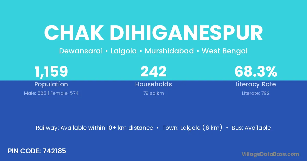 Lalgola (6 km) is the nearest town to Chak Dihiganespur village for major economic activities and is located approximately 6 km away.