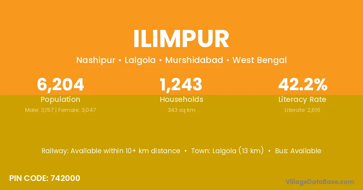 Lalgola (13 km) is the nearest town to Ilimpur village for major economic activities and is located approximately 13 km away.