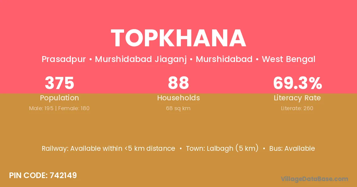 Lalbagh (5 km) is the nearest town to Topkhana village for major economic activities and is located approximately 5 km away.