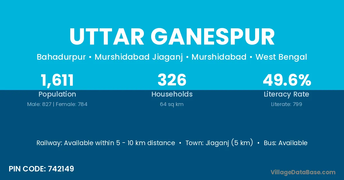 Jiaganj (5 km) is the nearest town to Uttar Ganespur village for major economic activities and is located approximately 5 km away.