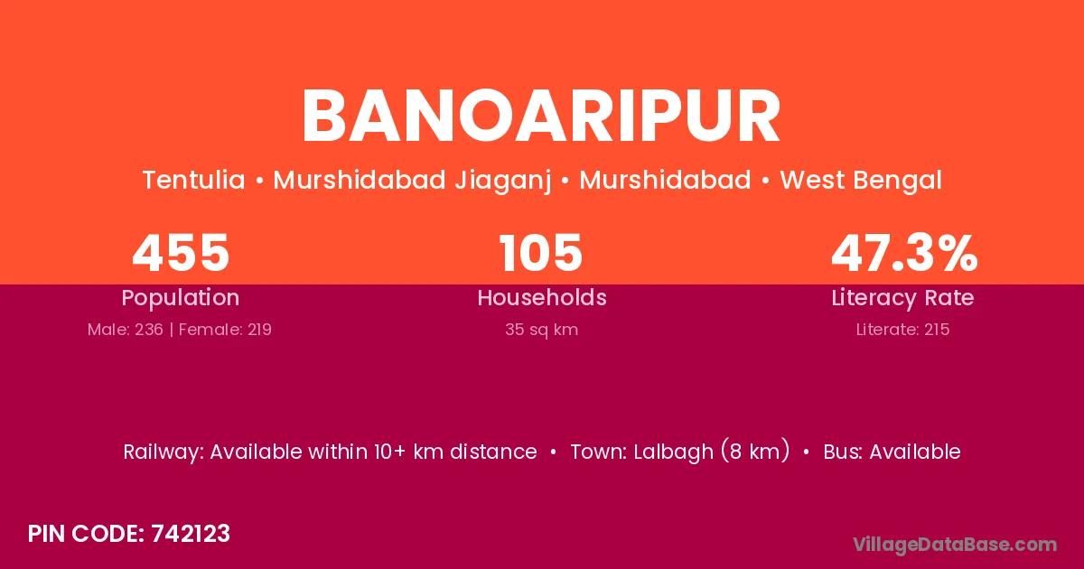 Lalbagh (8 km) is the nearest town to Banoaripur village for major economic activities and is located approximately 8 km away.