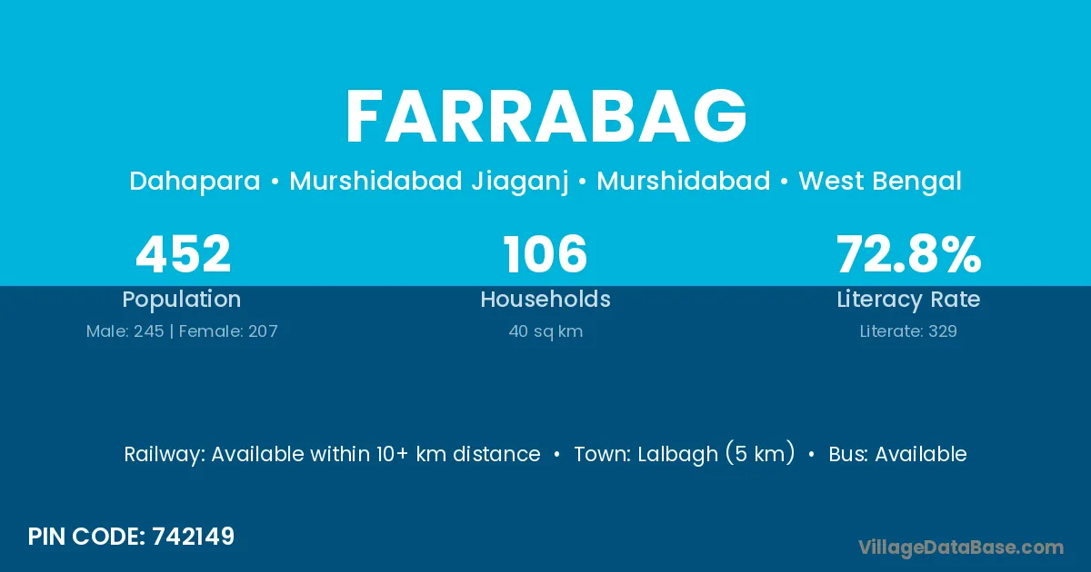 Lalbagh (5 km) is the nearest town to Farrabag village for major economic activities and is located approximately 5 km away.