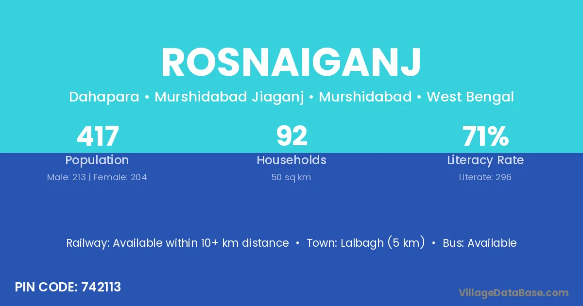 Lalbagh (5 km) is the nearest town to Rosnaiganj village for major economic activities and is located approximately 5 km away.