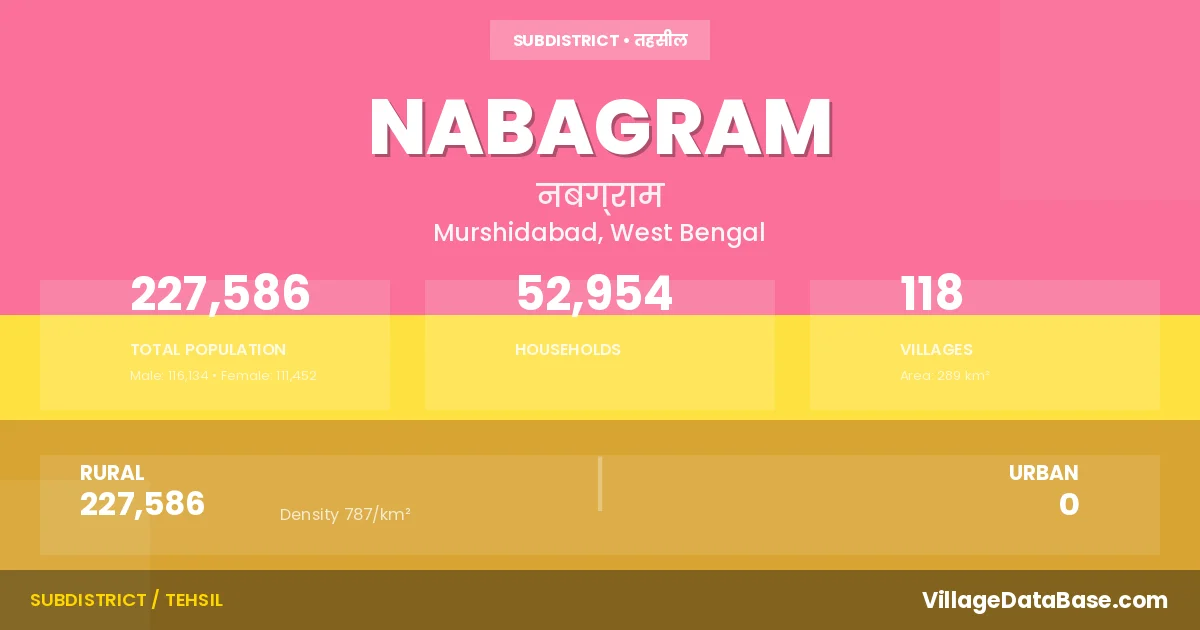 According to the 2011 census The total area of Nabagram Subdivision is 289 km², with a population of 227586 people. The population density is 787 inhabitants per square kilometre, and there are approximately 52954 houses in the sub district.