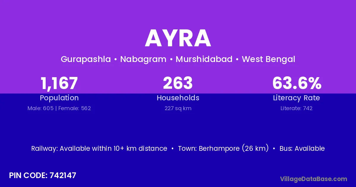 Berhampore (26 km) is the nearest town to Ayra village for major economic activities and is located approximately 26 km away.