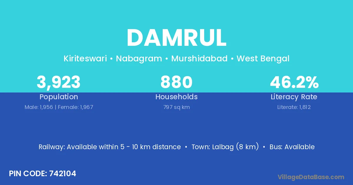 Lalbag (8 km) is the nearest town to Damrul village for major economic activities and is located approximately 8 km away.
