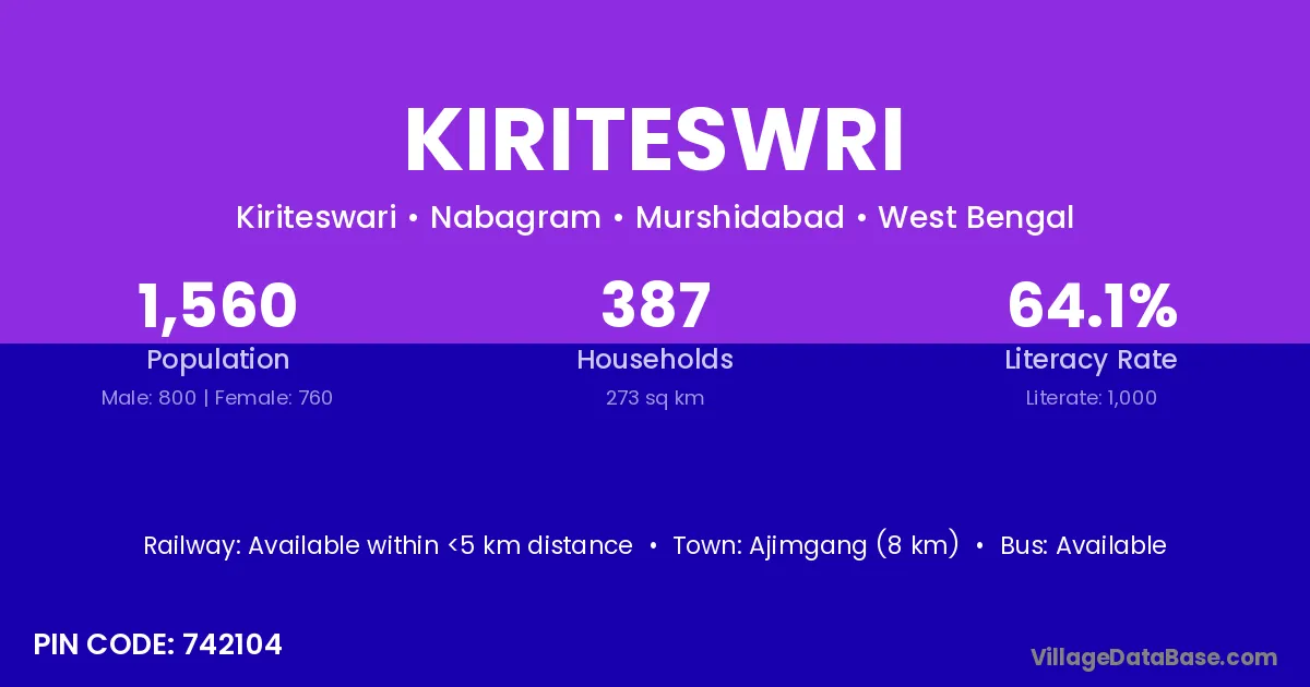 Ajimgang (8 km) is the nearest town to Kiriteswri village for major economic activities and is located approximately 8 km away.