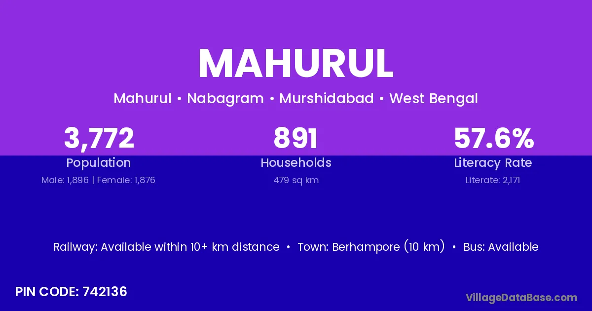 Berhampore (10 km) is the nearest town to Mahurul village for major economic activities and is located approximately 10 km away.