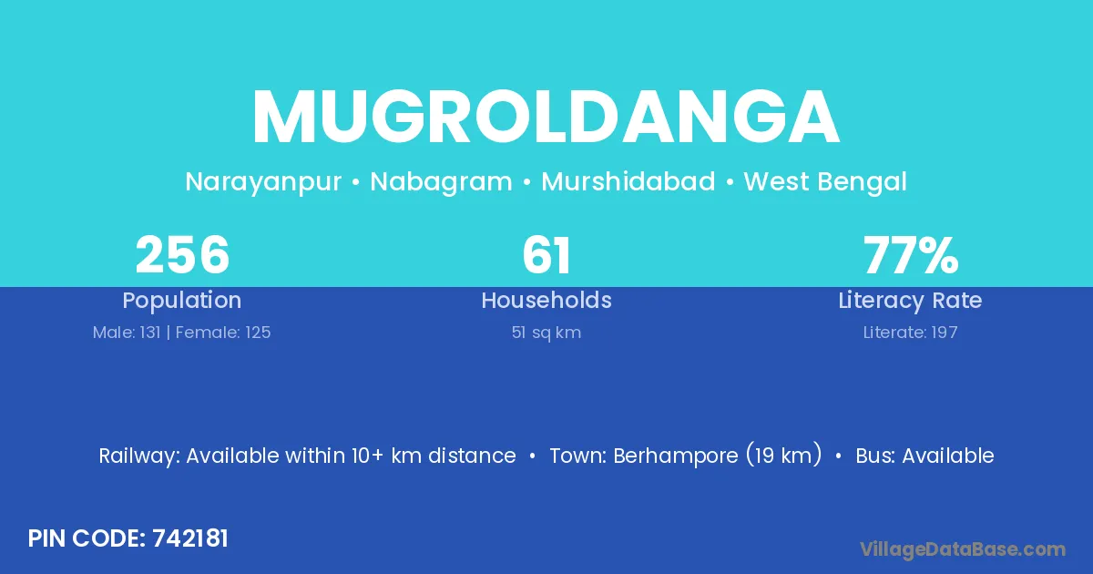Berhampore (19 km) is the nearest town to Mugroldanga village for major economic activities and is located approximately 19 km away.