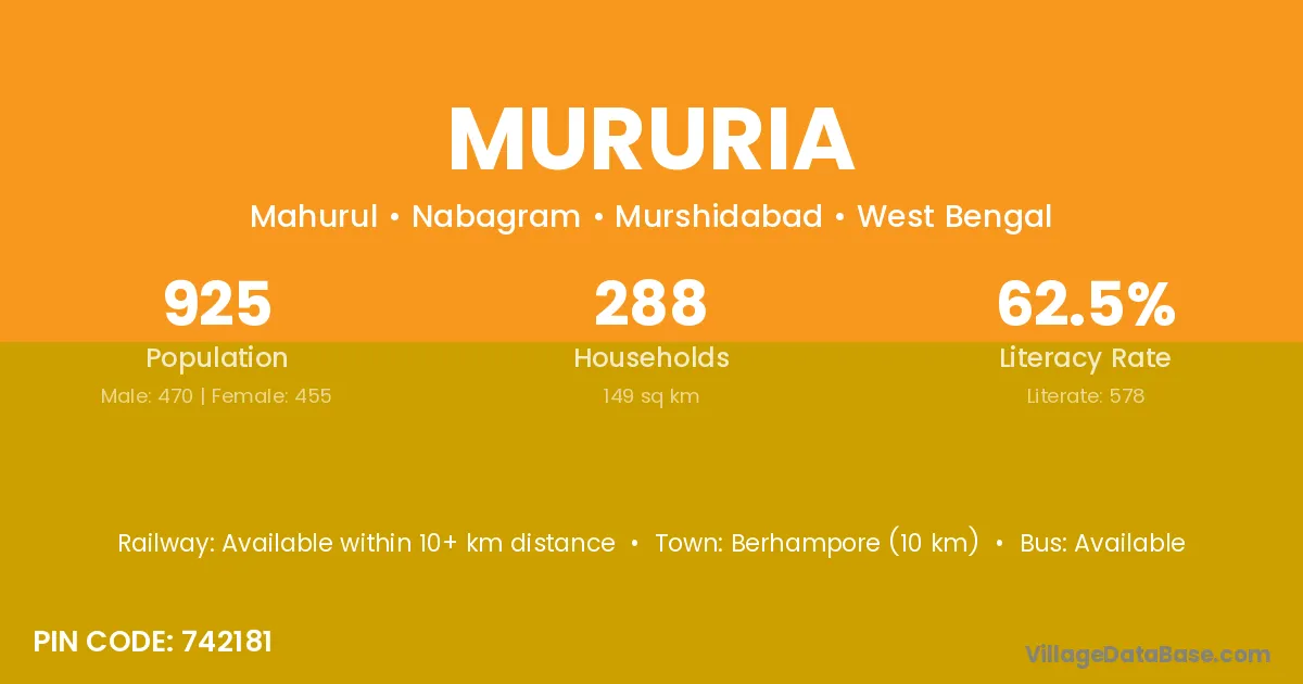Berhampore (10 km) is the nearest town to Mururia village for major economic activities and is located approximately 10 km away.