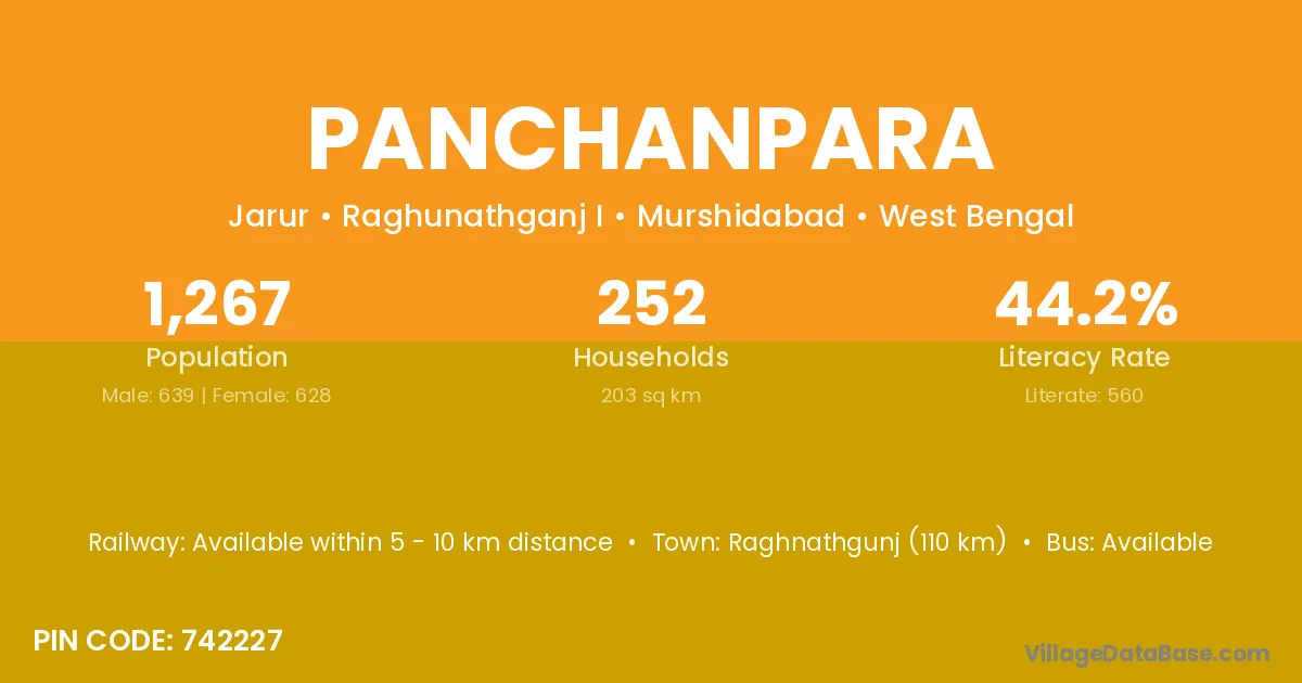Panchanpara village has a total population of 1,267 people, of which 639 are males and 628 are females.