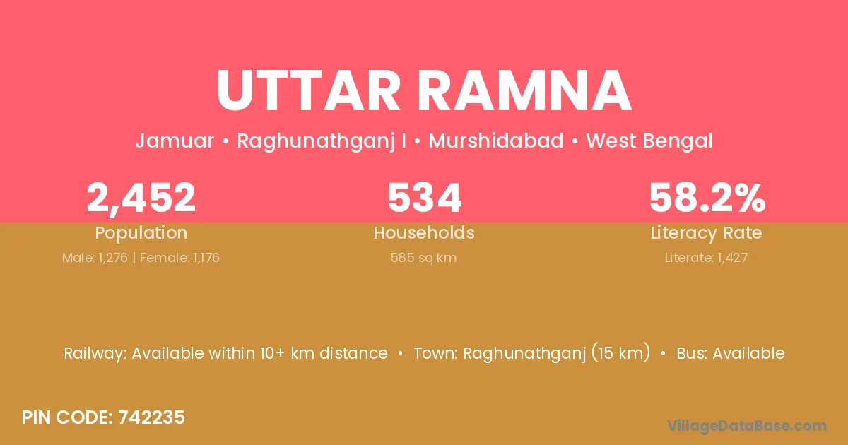 Raghunathganj (15 km) is the nearest town to Uttar Ramna village for major economic activities and is located approximately 15 km away.