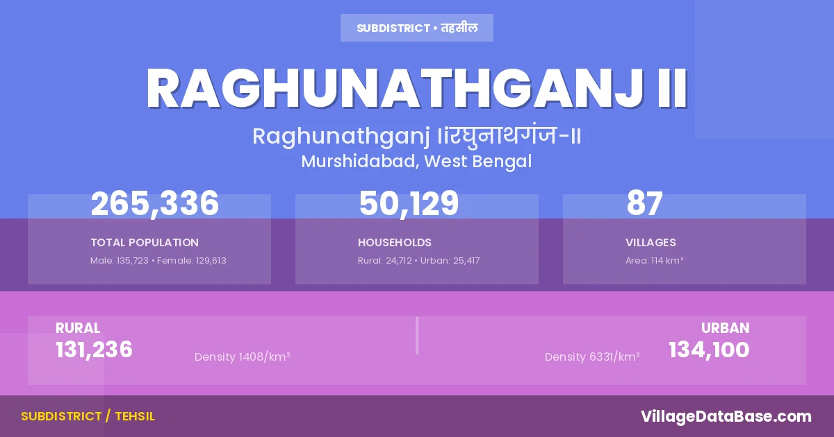 According to the 2011 census The total area of Raghunathganj II Subdivision is 114 km², with a population of 265336 people. The population density is 2,320 inhabitants per square kilometre, and there are approximately 50129 houses in the sub district.