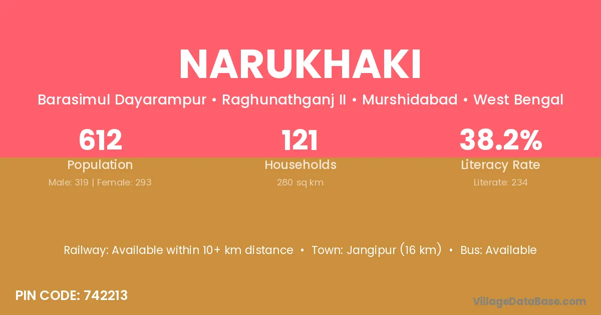 Jangipur (16 km) is the nearest town to Narukhaki village for major economic activities and is located approximately 16 km away.