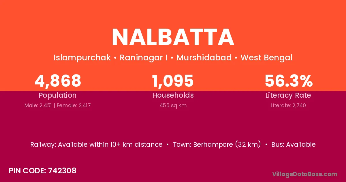 Berhampore (32 km) is the nearest town to Nalbatta village for major economic activities and is located approximately 32 km away.