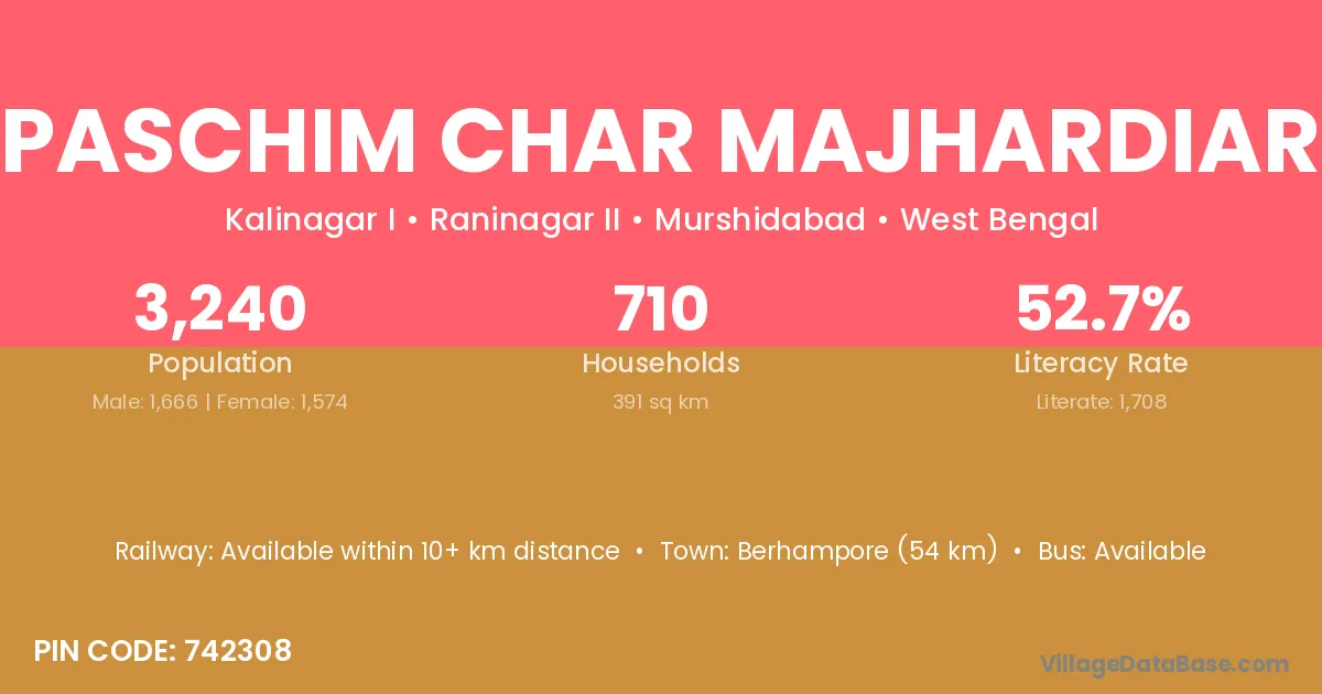 Berhampore (54 km) is the nearest town to Paschim Char Majhardiar village for major economic activities and is located approximately 54 km away.