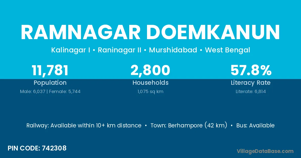 Berhampore (42 km) is the nearest town to Ramnagar Doemkanun village for major economic activities and is located approximately 42 km away.