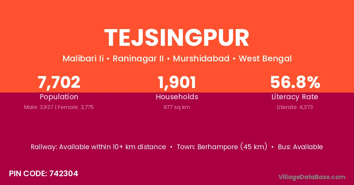 Berhampore (45 km) is the nearest town to Tejsingpur village for major economic activities and is located approximately 45 km away.