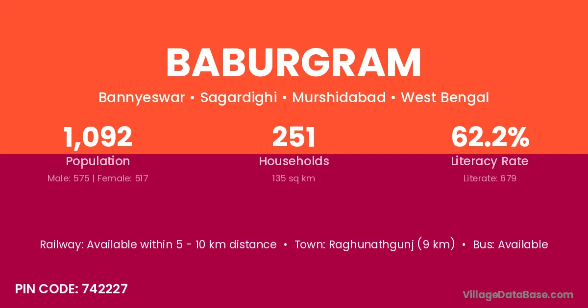 Raghunathgunj (9 km) is the nearest town to Baburgram village for major economic activities and is located approximately 9 km away.