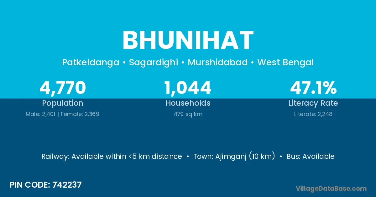 Ajimganj (10 km) is the nearest town to Bhunihat village for major economic activities and is located approximately 10 km away.