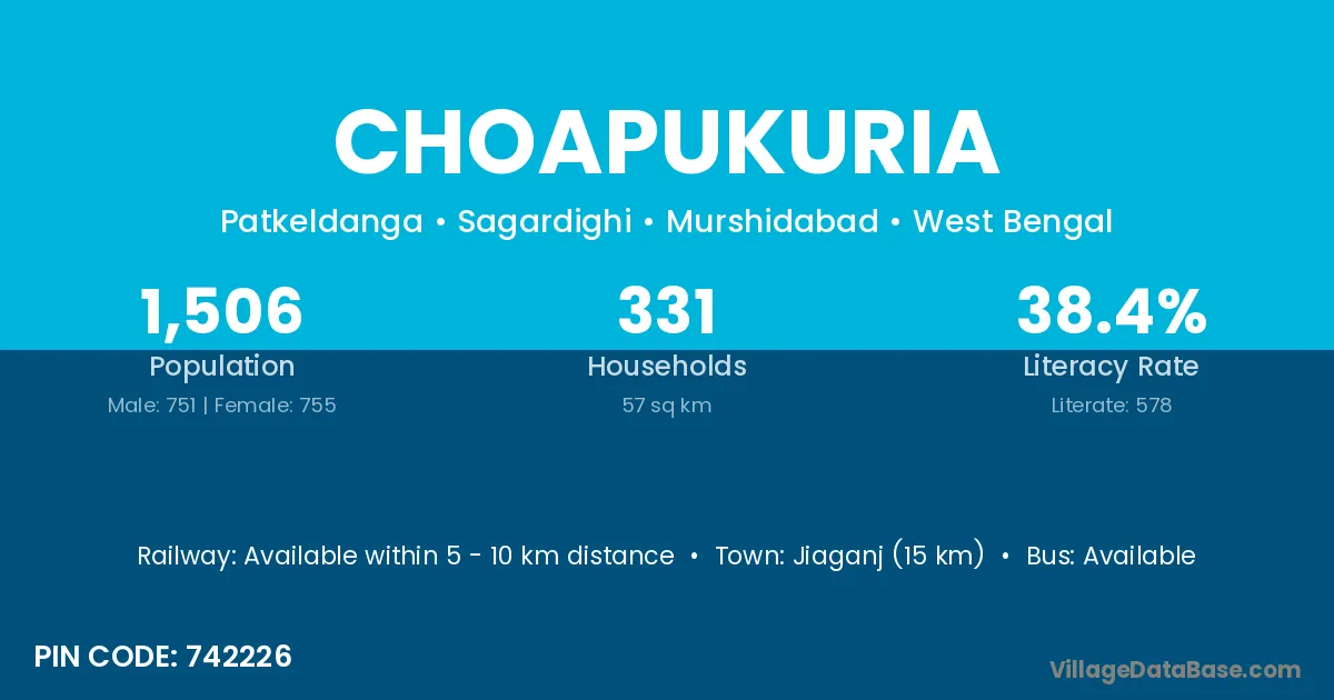 Jiaganj (15 km) is the nearest town to Choapukuria village for major economic activities and is located approximately 15 km away.