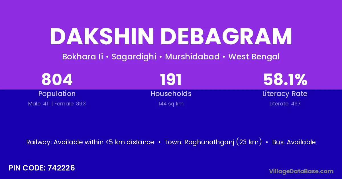 Raghunathganj (23 km) is the nearest town to Dakshin Debagram village for major economic activities and is located approximately 23 km away.