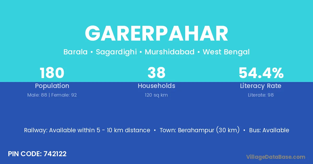 Berahampur (30 km) is the nearest town to Garerpahar village for major economic activities and is located approximately 30 km away.