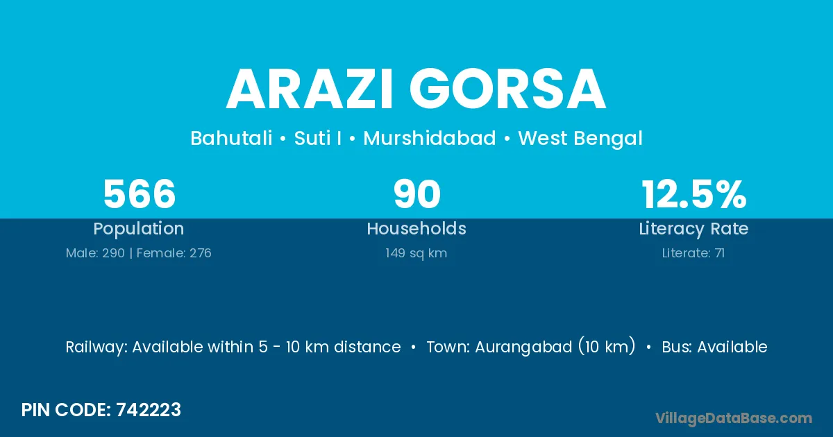 Arazi Gorsa village is located in the Suti I Subdivision of the Murshidabad district in West Bengal.