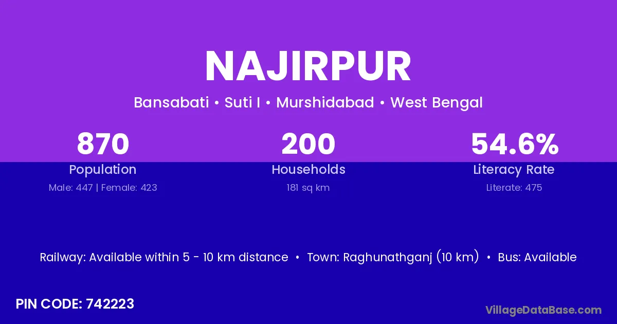 Raghunathganj (10 km) is the nearest town to Najirpur village for major economic activities and is located approximately 10 km away.