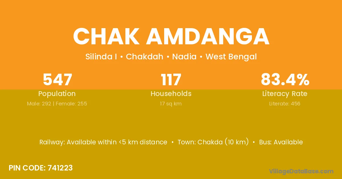 Chak Amdanga village has a total population of 547 people, of which 292 are males and 255 are females.