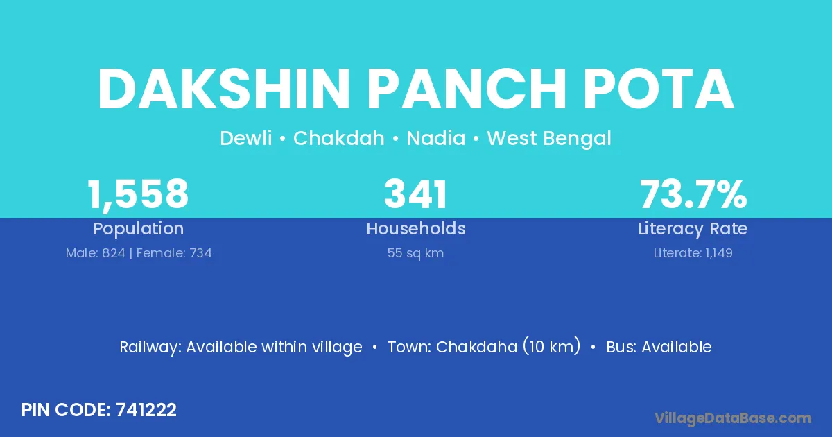 Chakdaha (10 km) is the nearest town to Dakshin Panch Pota village for major economic activities and is located approximately 10 km away.