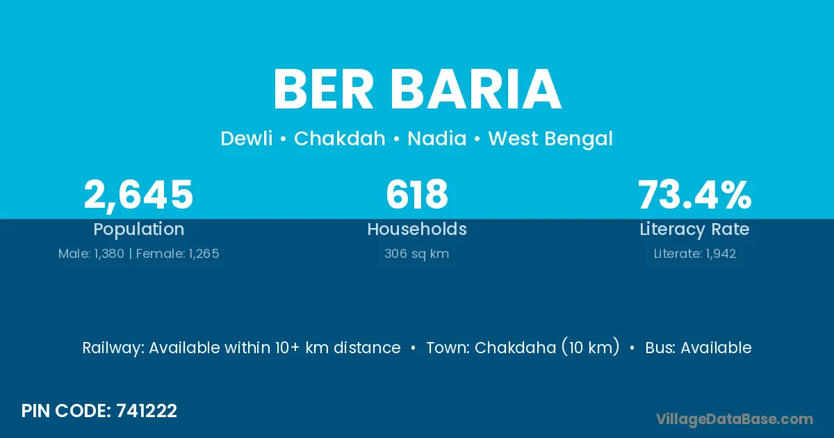 Chakdaha (10 km) is the nearest town to Ber Baria village for major economic activities and is located approximately 10 km away.