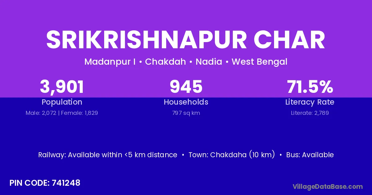 Chakdaha (10 km) is the nearest town to Srikrishnapur Char village for major economic activities and is located approximately 10 km away.