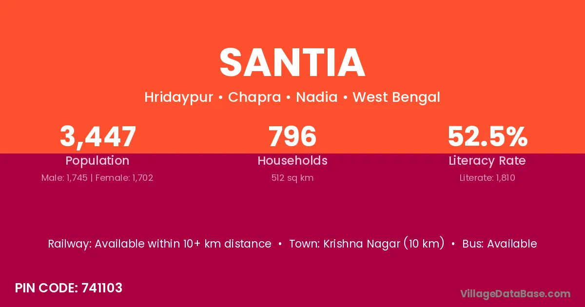 Krishna Nagar (10 km) is the nearest town to Santia village for major economic activities and is located approximately 10 km away.