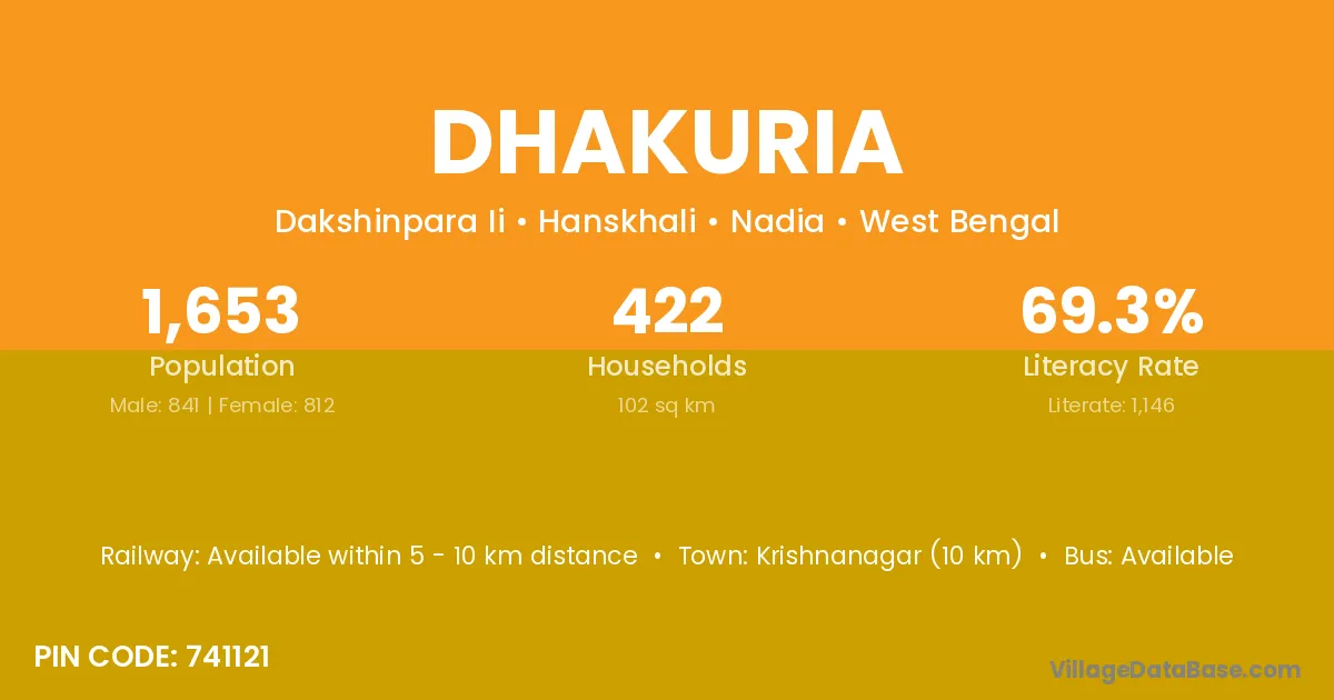 Krishnanagar (10 km) is the nearest town to Dhakuria village for major economic activities and is located approximately 10 km away.