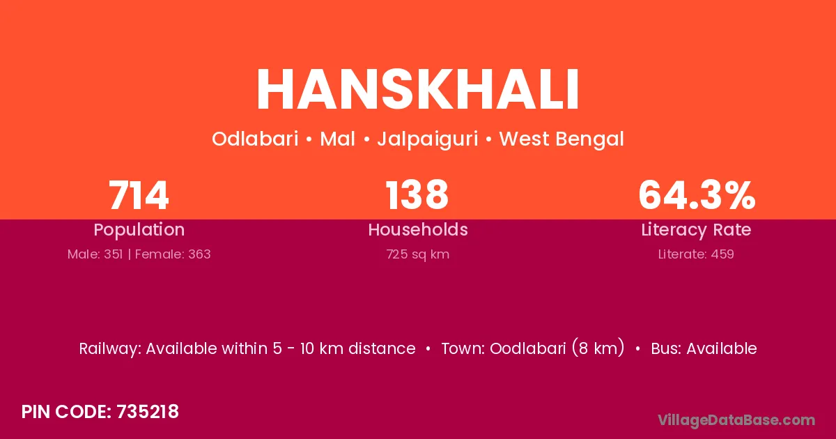 Hanskhali village has a total population of 5,066 people, of which 2,645 are males and 2,421 are females.