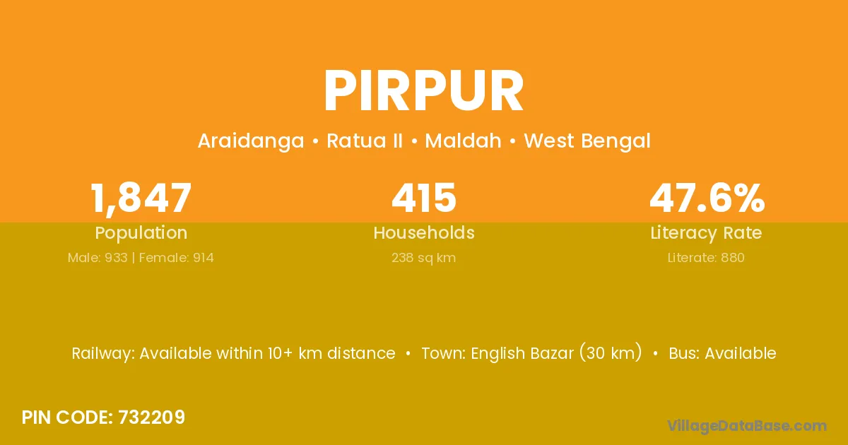 Krishnanagar (24 km) is the nearest town to Pirpur village for major economic activities and is located approximately 24 km away.