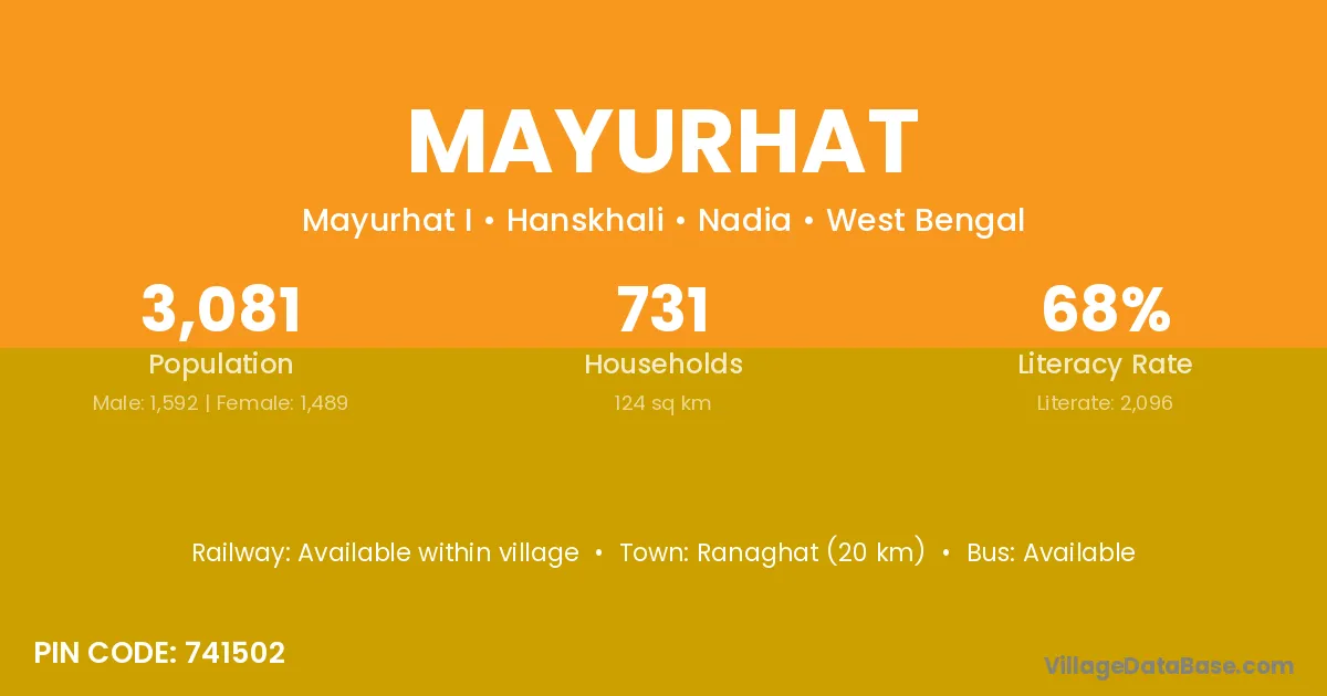 Ranaghat (20 km) is the nearest town to Mayurhat village for major economic activities and is located approximately 20 km away.
