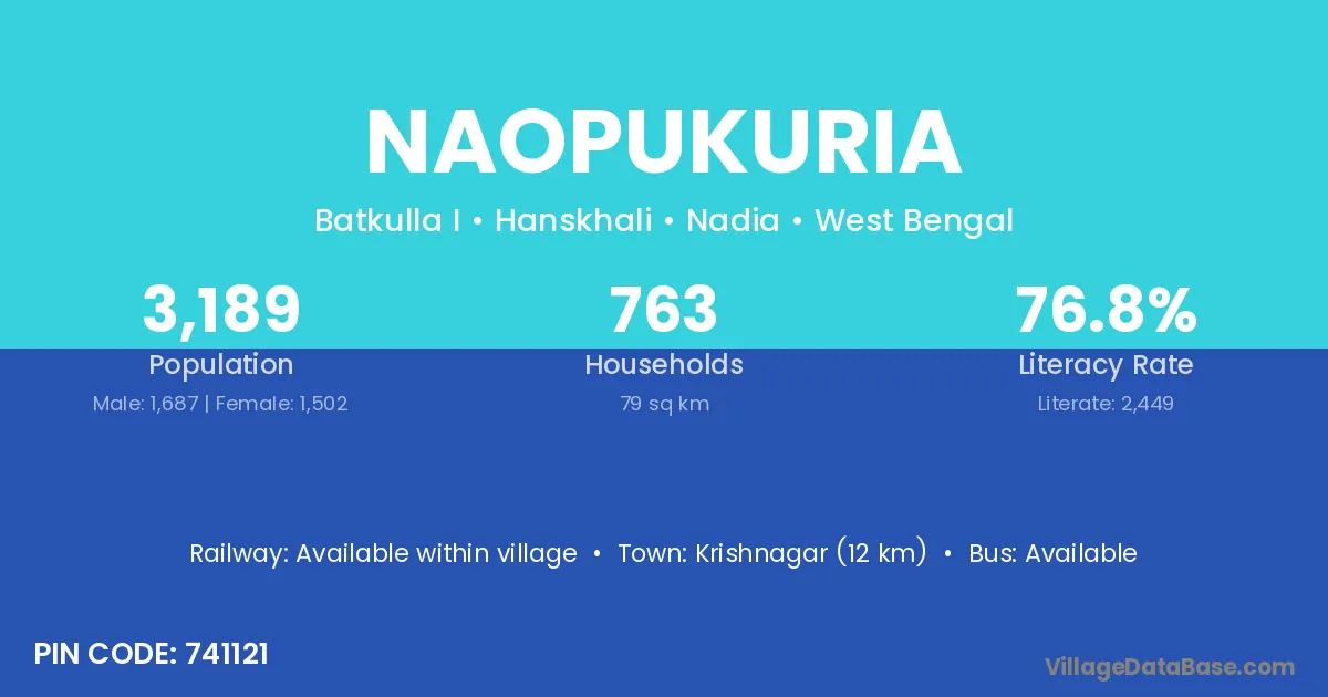 Krishnagar (12 km) is the nearest town to Naopukuria village for major economic activities and is located approximately 12 km away.