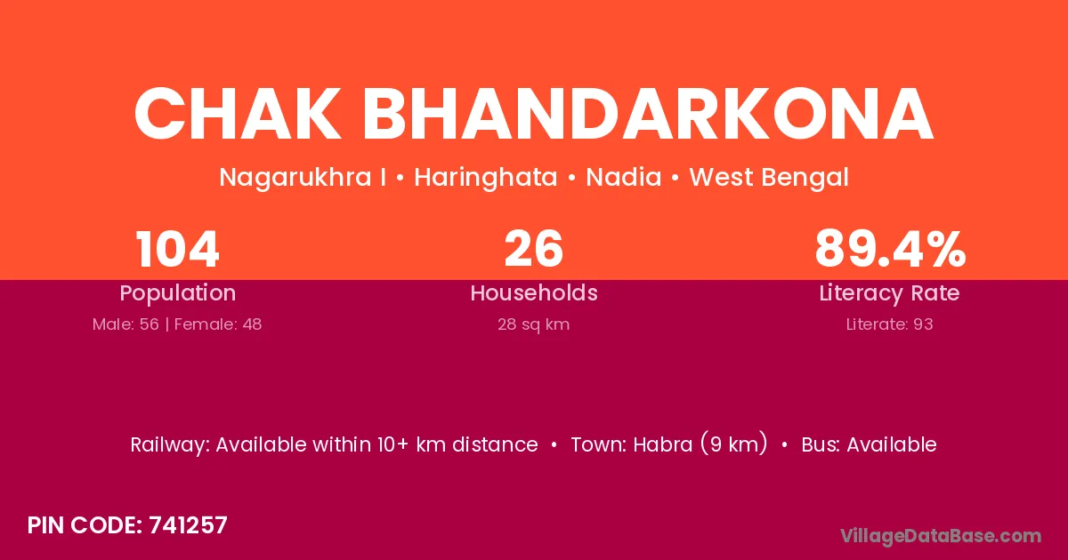 Chak Bhandarkona village is located in the Haringhata Subdivision of the Nadia district in West Bengal.