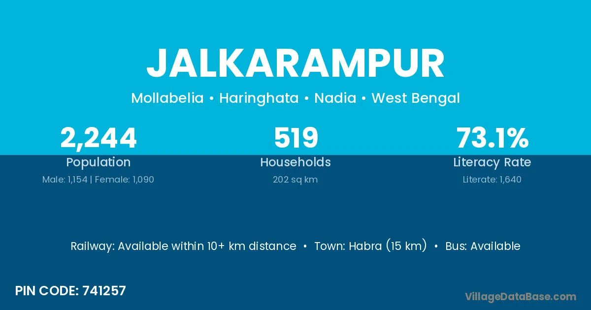 Habra (15 km) is the nearest town to Jalkarampur village for major economic activities and is located approximately 15 km away.