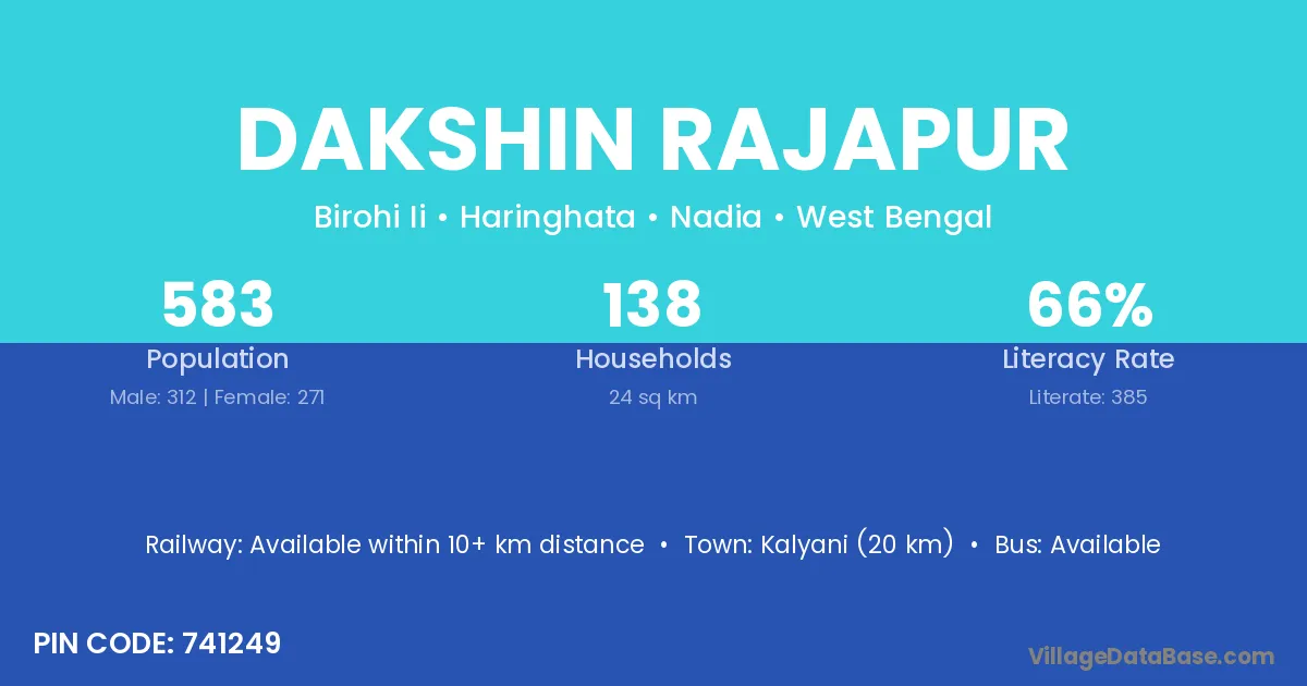 Kalyani (20 km) is the nearest town to Dakshin Rajapur village for major economic activities and is located approximately 20 km away.