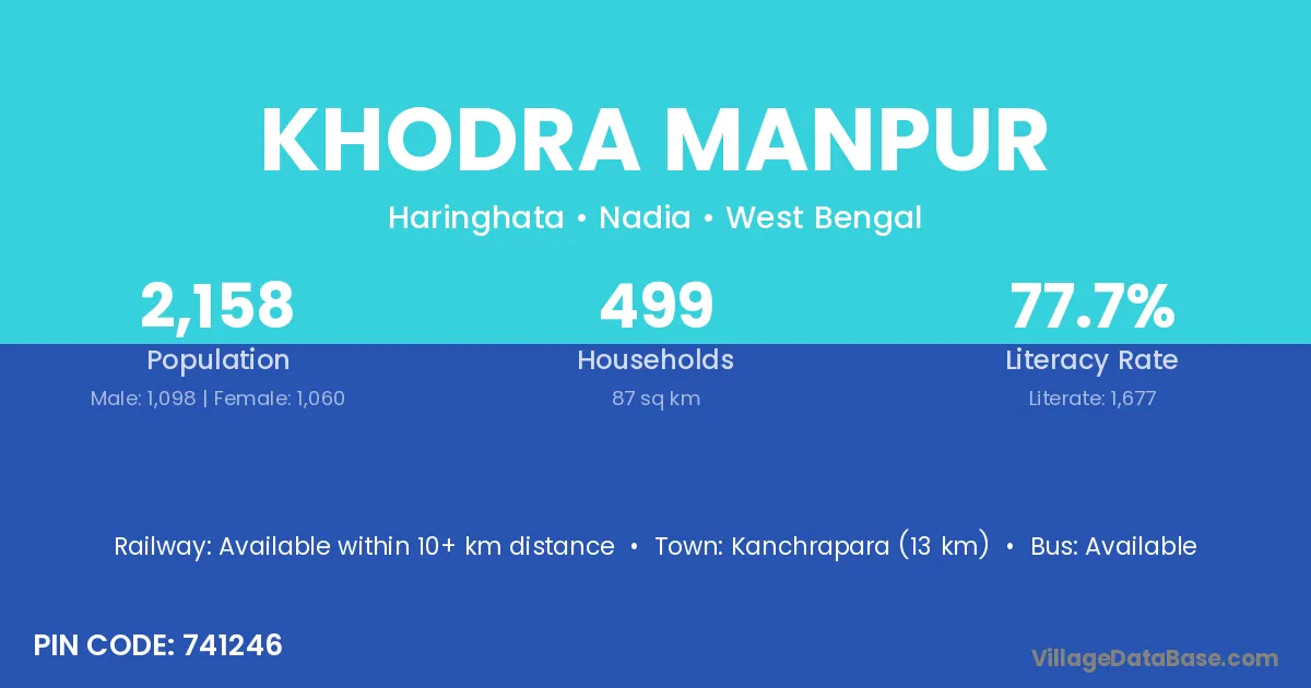 Kanchrapara (13 km) is the nearest town to Khodra Manpur village for major economic activities and is located approximately 13 km away.