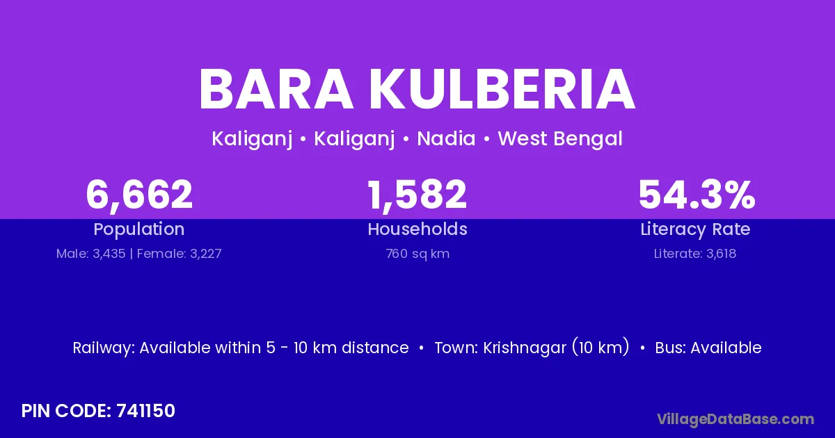 Krishnagar (10 km) is the nearest town to Bara Kulberia village for major economic activities and is located approximately 10 km away.