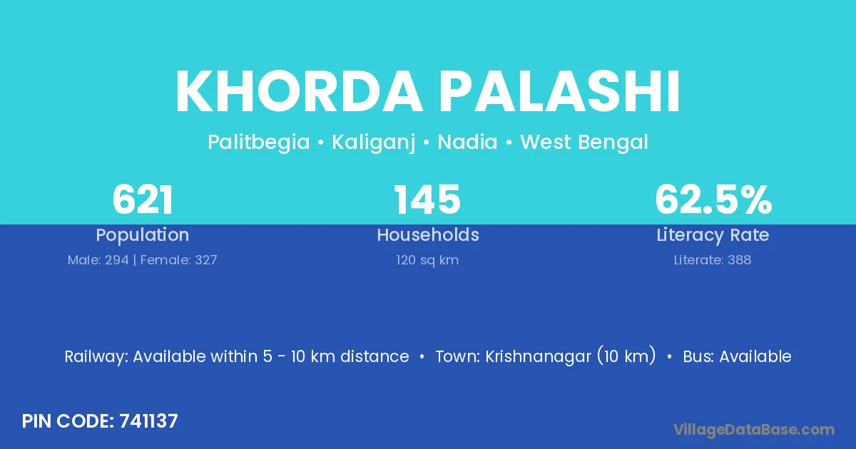 Krishnanagar (10 km) is the nearest town to Khorda Palashi village for major economic activities and is located approximately 10 km away.