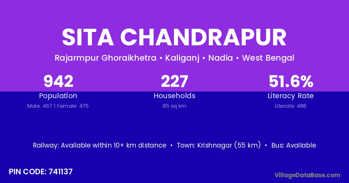 Krishnagar (55 km) is the nearest town to Sita Chandrapur village for major economic activities and is located approximately 55 km away.