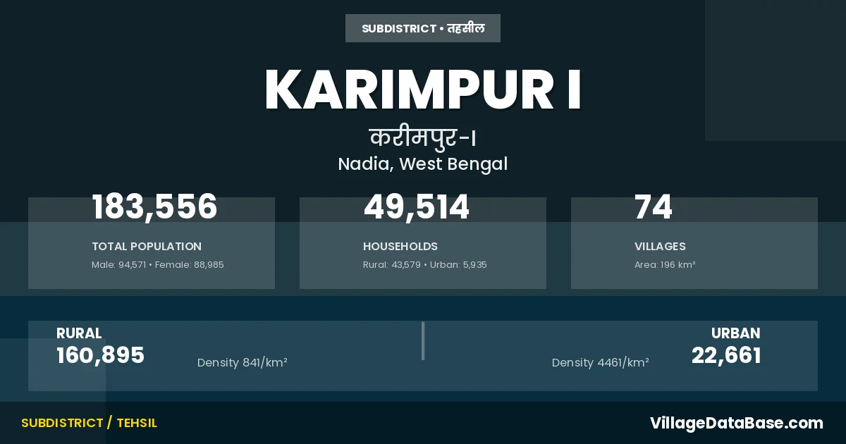 According to the 2011 census The total area of Karimpur I Subdivision is 196 km², with a population of 183556 people. The population density is 934 inhabitants per square kilometre, and there are approximately 49514 houses in the sub district.