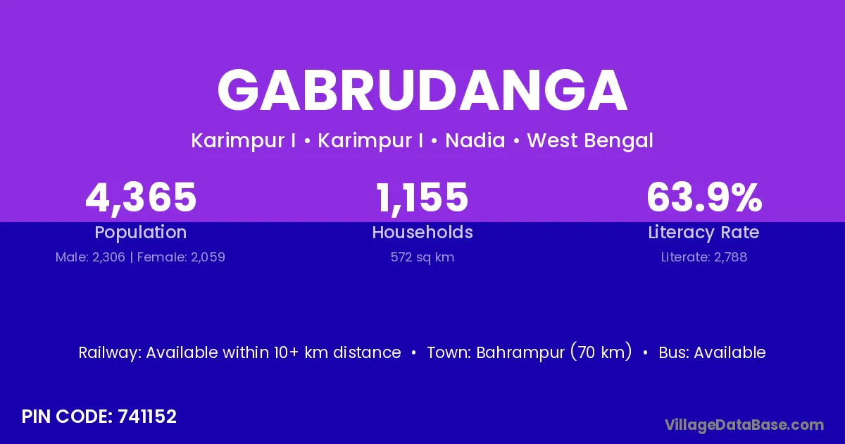 Bahrampur (70 km) is the nearest town to Gabrudanga village for major economic activities and is located approximately 70 km away.