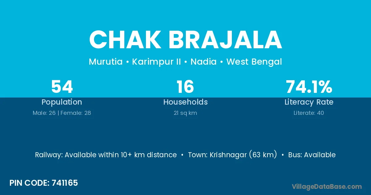 Krishnagar (63 km) is the nearest town to Chak Brajala village for major economic activities and is located approximately 63 km away.