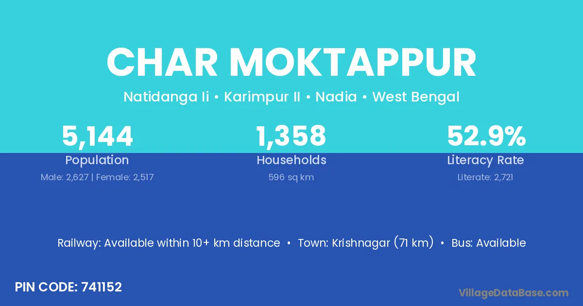 Krishnagar (71 km) is the nearest town to Char Moktappur village for major economic activities and is located approximately 71 km away.